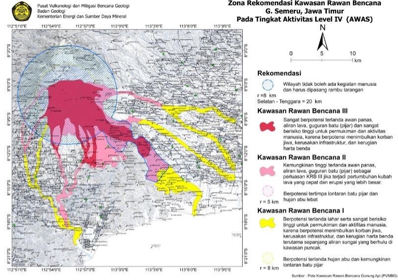 - Radius Lontaran Batu: Masyarakat dilarang beraktivitas dalam radius 8 km dari kawah/puncak Gunung Api Semeru karena rawan bahaya lontaran batu (pijar).