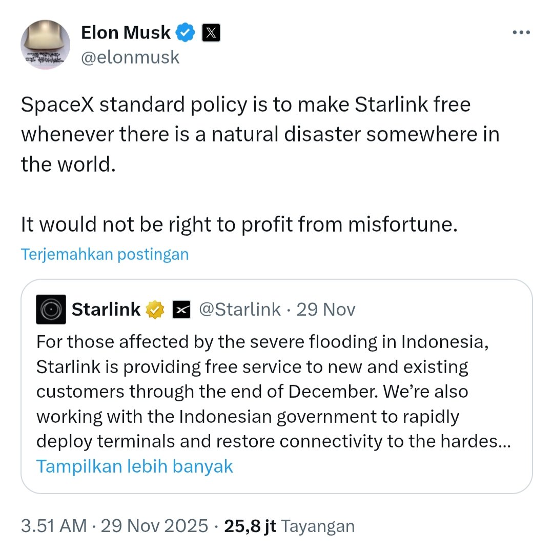 “Kebijakan standar SpaceX adalah menggratiskan Starlink setiap kali terjadi bencana alam di suatu tempat di dunia. Tidaklah benar mengambil untung dari musibah,” ungkap Elon Musk dalam unggahannya di X.