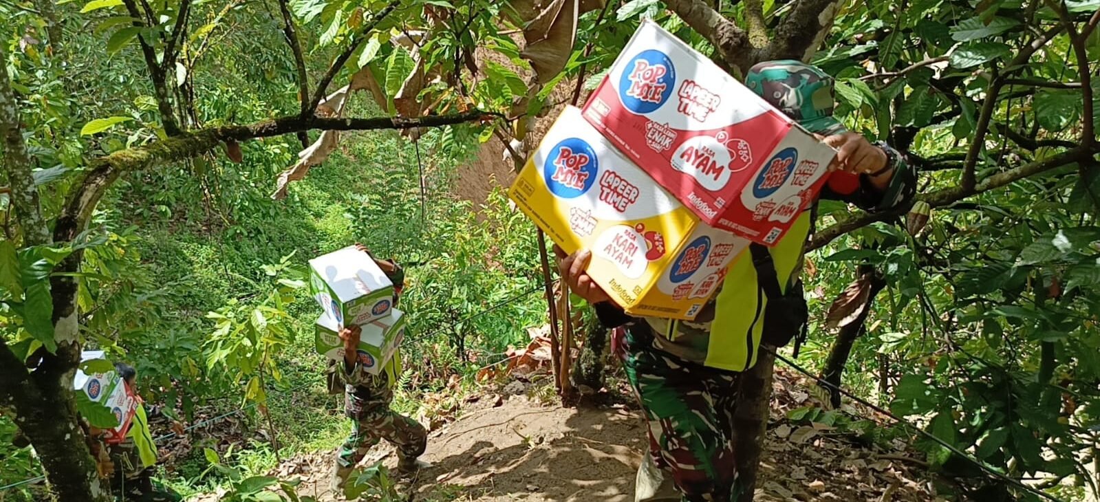 Mereka berjalan kaki selama dua jam demi memastikan bantuan logistik penting sampai ke Desa Rumah Bundar, sebuah permukiman yang terisolir akibat terputusnya jalur transportasi.