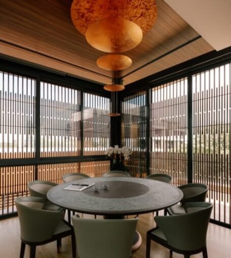 - Ruang Loteng: Ruang hiburan dilengkapi sofa modular kulit Minotti, sementara ruang teh menampilkan suasana oriental khas dengan meja bundar dan lampu gantung berwarna emas.