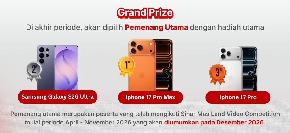 Jangan lewatkan kesempatan untuk memperebutkan deretan gadget kasta tertinggi di sesi Grand Prize, mulai dari iPhone 17 Pro Max, Samsung Galaxy S26 Ultra, hingga paket staycation eksklusif di hotel-hotel berbintang milik jaringan Sinar Mas Land.