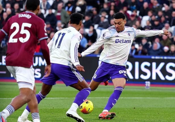 - Umpan Youri Tielemans berhasil diterima oleh Morgan Rogers, yang berada di tengah kotak penalti. Dengan penuh ketenangan, Rogers mengendalikan bola tersebut dan kemudian melepaskan tembakan jitu yang melintas melewati dua pemain West Ham.