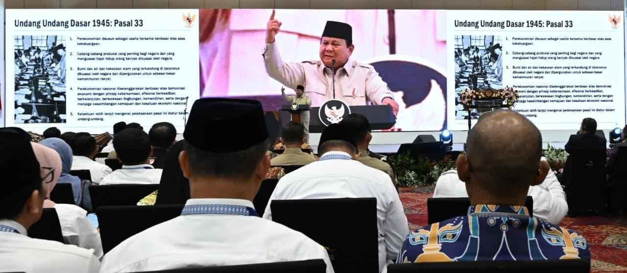 Dalam pidatonya, Prabowo juga menyentil para kepala daerah. Ia mengingatkan mereka untuk kembali pada esensi Pasal 33 Undang-Undang Dasar 1945.