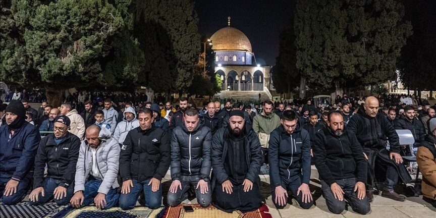 Al-Quds, Palestina – Suasana khusyuk menyelimuti kompleks Masjid Al-Aqsa saat ribuan warga Palestina menunaikan salat Tarawih pertama.