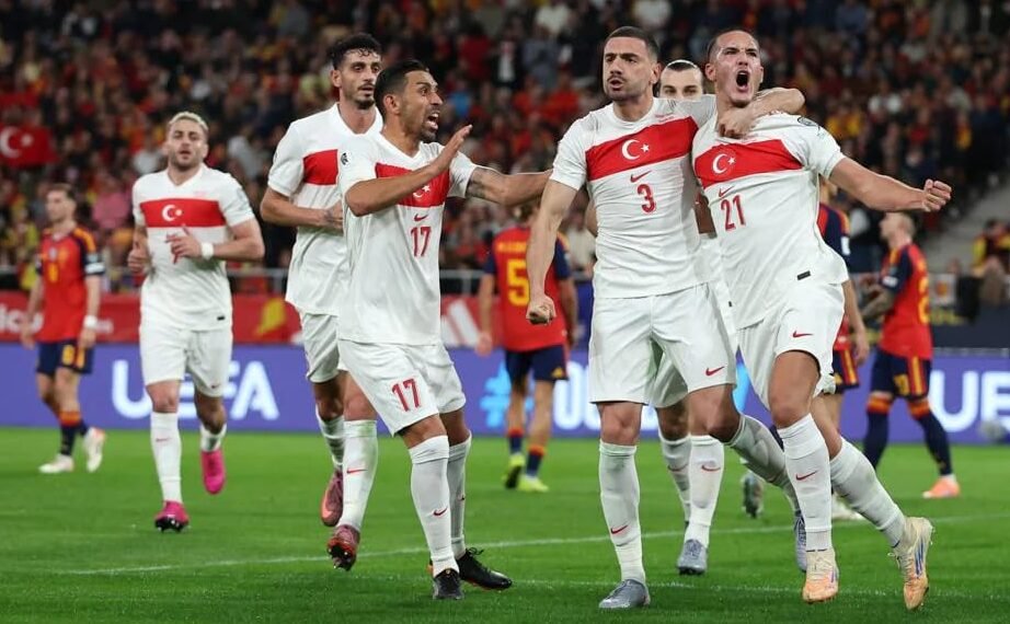 • Orkun Kokcu mengendalikan sebuah bola muntah dari Spanyol dan meneruskannya kepada Salih Ozcan, yang langsung melepaskan tembakan penuh presisi yang menemukan sisi kiri bawah gawang.