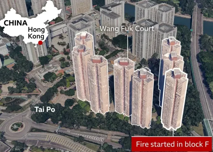 Kompleks Wang Fuk Court, saat kejadian sedang menjalani renovasi dan diselimuti perancah bambu serta jaring hijau.